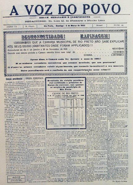 A Voz do Povo, jornal corajosos que ousou enfrentar a oligarquia política da cidade, em edição de 5 de março de 1922. Página 490 do Álbum Illustrado da Comarca de de Rio Preto, de 1929