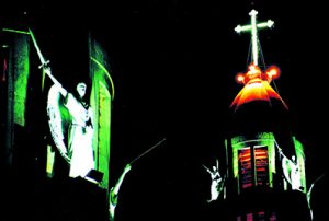 Os anjos na torre iluminada da Basílica, em foto de Paulo Berton