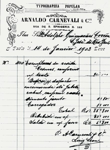 Nota fiscal exarada pela Typographia Popular, de São Paulo. Festas do final de ano atrasou a revista que deveria ter circulado em dezembro de 1901