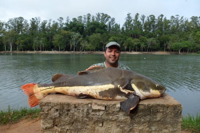 • Pescador exibe seu troféu pescado no rio Tietê, em Glicério.